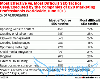 B2C企业认为最有效的SEO策略主要有更新网站内容,关键词管理,原创内容以及优化标签;而难度最高的SEO策略则主要是外链,社会化媒体整合以及原创内容。对于B2C企业而言博客显得不那么关键。