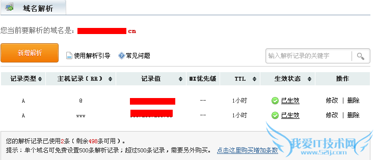 这个截图实现的功能,就是通过将带www和不带www的域名解析到存放网站的服务器(空间),实现的效果就是通过一级域名或者二级域名都可以正常访问你的网站,至于截图中的CNAME记录,其实是将网站的二级域名通过做别名解析到网站服务器的,其实这里只需要把域名都做A记录即可,这里是为了测试 CNAME记录的效果而已,有一点是你们必须了解的,就是一级域名是不可以做CNAME解析的。在添加A记录操作的过程中,如果输入WWW或者@提交失败,建议你将网站的所有缓存清空,重新操作提交即可成功解析。