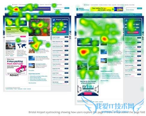 看看这个布里斯托尔机场网站的眼动热点图。这张图表明,首屏只展现少量内容可以引导更多用户往下浏览及点击。