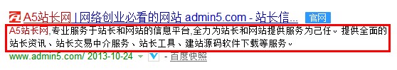 上图为A5站长网的描述,看看这段描述,直接为用户提供了想要找到的信息,因为网站主要为站长服务,所以描述上写着提供全面的站长资讯、站长交易、站长工具、建站源码,这些都是用户需求的,最重要的是长度不长也不短,刚好。