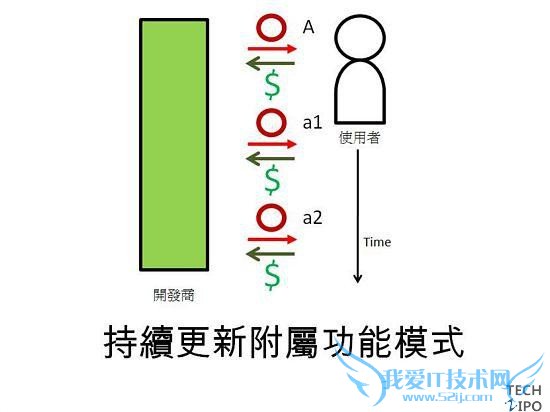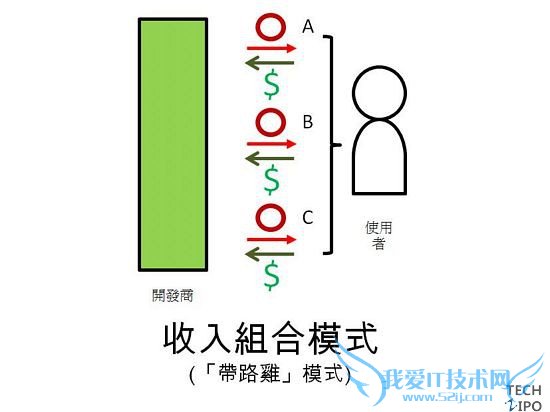这里指的是除了主程序之外,持续推出可以额外付费下载的附属功能象是游戏的新场景或是拍照软件的新滤镜效果等,让收入可以持续增长。同样的也可以让主程序的费用是$0(搭配广告模式),或是运用收入组合模式的心理效果。