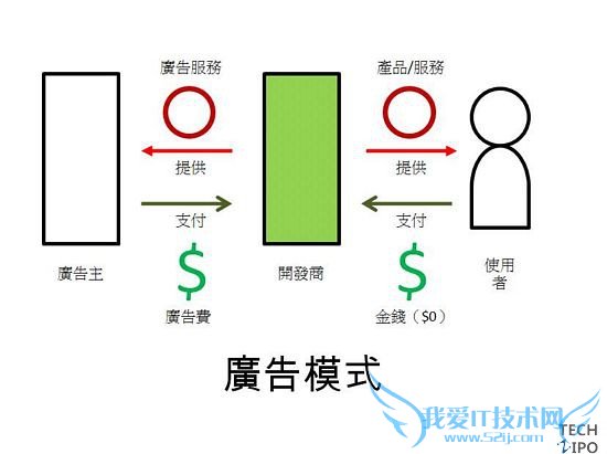 图解:使用者无需付费,广告主支付广告费给开发者,开发者因而获利。