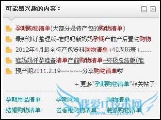 从百度或Google等搜索引擎的搜索结果点击播种网的帖子,进入播种网之后,在网页左下角会推荐“可能感兴趣的内容”,这个弹框中推荐的内容都是相关性非常高的帖子,能带来二次点击,对播种网的pv提升有一定的帮助。同时,它也能把用户带到纵横搜索页面,引导用户利用播种网的纵横搜索功能。如:搜索“孕期购物清单”,会出现5条相关性高的帖子,通常播种网用户都会去点击这些感兴趣的内容,浏览相关的帖子。