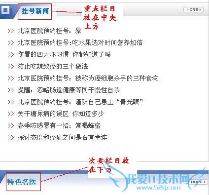 (1)首先要明确自己的重点栏目,所谓的重点栏目就是你每天着重更新内容的那个栏目,这些重点栏目应该要放到网站的正中央,然后用css着重突出该栏目的特色,让用户能够关注到这个重点栏目。