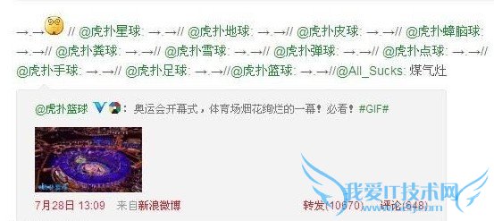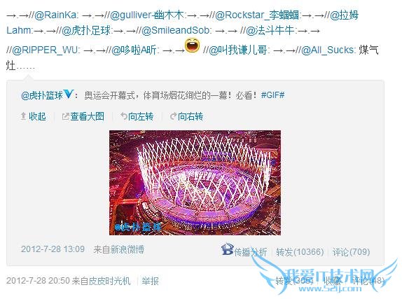 这是我在奥运开幕式后第二天下午开始做的,最高的时候有1w3,全都是真实的。这是我第二天起来上Tumblr时看到的一个镜头,我当时觉得这画面很美,再后来多看了几眼觉得总像什么似曾相识的东西。中午看我妈烧饭的时候……我悟出来了,原来是煤气灶点燃的一刹那,我就去发了这条微博,用了一些小技巧,你可看到All_Sucks 这个id是不存在的,这是我看到一个人有类似的id后拿来随便改了一下,我写了煤气灶,做了假的转发,用一系列的id划出了→.→,形成了排队的形式,但你知道要是显示出来所有的id都是没有此用户名……感觉很囧,在第一次做了人为的排队后,已经开始有大量的网友自发跟进队伍了,这时候我删了人为制造的一条,用真实有排队的id拼接在了这个后面,在晚上高峰期的时候做了再一次的转发,你看篮球号那么卖力了,作为二当家的足球号也要出把力是吧。