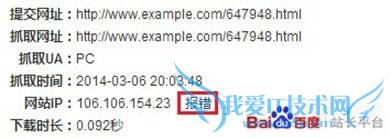 抓取诊断工具会检查站点与百度的连接是否畅通,若站长发现IP信息还是老旧的,可以通过“报错”通知百度搜索引擎更新IP,如下图所示: