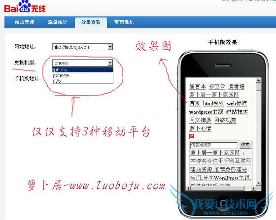 百度推出了移动建站平台,只需10分钟,简单配置一下,即可建立自己的手机wap网站。关于此移动建站平台的使用,卢松松已经介绍的很详细了,这里,仅仅说明一下其wap网站模拟器的使用,目前百度无线仅仅支持iphone、gphone、N95的预览。