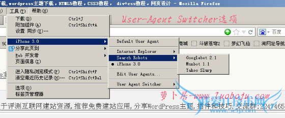 三、firefox插件。Google在网站站长工具中推荐了几款Firefox插件:User-Agent Switcher ,wmlbrowser ,XHTML Mobile Profile ,在本地叶测试了一下User-Agent Switcher的显示效果,其余的插件,就不一一介绍了,有兴趣的朋友可以测试一下。预览图如下: