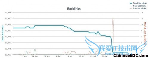 从上图:九块邮网站外链总数波动图,从波动图的趋势来看,整体呈下降趋势;从数量上来分析,下降的量并不大,在20条外链以内;从外链下降的原因上分析,主要是丢失链接大于新增链接,特别是在8月初,波动比较明显;