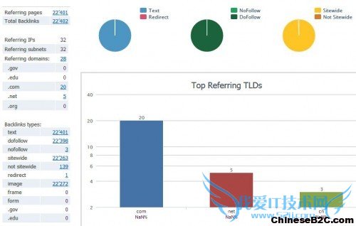 从外链域名后辍来看,相对比较集中,因为外链总域名数也只有28个,从上图中可以看出,.com的外链域名数有20个,.net外链域名数有5个,.cn外链域名数有3个;