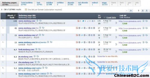 打开九块邮网站详细的外链列表查看,绝大部分外链来自于秀当网以及秀当网的几个分站,从这里面应该可以推断秀当网和九块邮网站同属一家,否则像这种淘宝购物导航类的网站怎么会给全站链接,而九块邮网站在黄金位置—导航部分添加秀当网的链接。