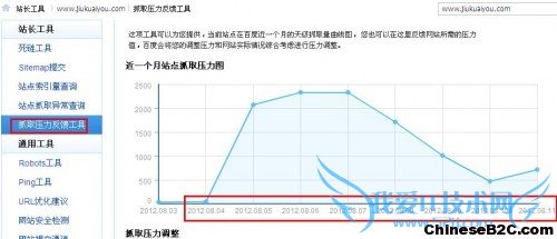 抓取压力反馈工具,从统计图来看,网站从8月4号在百度的反应已经在很大的变化,每天百度都有来抓取数据,最大抓取量在2400条/天,不过, 从8月 7号到8月10号,这几天抓取量逐步减少,从10号开始每天的抓取量又在增加,这样是好事,可能是他们在8月7号做了什么操作影响到蜘蛛的抓取,这个很有 可能是操作了robots.txt文件,在前面的资料分析里面有写道:为了避免站内产品页面相似度过大,所以将产品页面屏蔽百度的收录了,很可能是这个原 因导致抓取量逐步下降,不过,现在网站每天的抓取量又在上升了,算是好事。