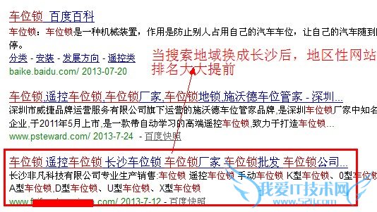 做推广的朋友都知道这几天百度在频繁调整算法,但笔者昨天与今天都注意到一个现象。搜索泛关键词时,地区性网站的整体排名都大大提升了,而且连续 3天保持如此。以往,百度只讲地区性网站提升几个排名,但这一次,笔者注意到一批网站的排名直接提升10多位,如笔者搜索车位锁时,一同城对手排名在25 位,但笔者将搜索地域换成长沙时,再搜索车位锁,其排名出现了惊人的逆袭,直接排名第4,如下图所示。