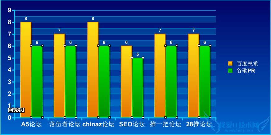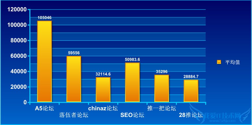 从图片中可以看出A5论坛对绝对领先的优势处于第一位,领先于第二名差不多2倍。我们可以看以下更直观的图