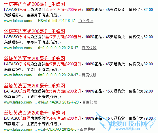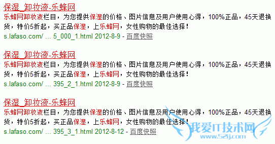 如上图所示,在百度中的截图,就可以看到,URL本身是不同的,也不是参数的原因,但是title却是相同的,这种情况的出现的原因就在于程序中各种排列组合的滥用,很多情况下,我们一般有以下几种组合“热销”和“推荐”和“好评”和“最新”等等的栏目,但是这些组合仅仅是将产品顺序改变以下,在很多网站中,title和description却没有发生变化,这个情况在很多网站中都有出现,比如说乐蜂网,就是这样,然后造成了网站整体性的不同页面,标题title相同。