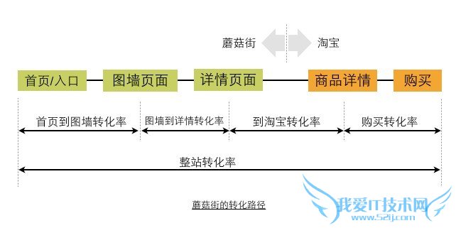 图中可以看到,蘑菇街的浏览-购买路径,存在“在蘑菇街逛”和“去淘宝买”两个部分。“在蘑菇街逛”的部分,用户从各种渠道进入首页或者推广页,进入瀑布流的图墙,这是第一步转化,基本是100%都会进瀑布流。然后用户看到很多分享的商品,翻着翻着,看到自己喜欢的点进去,进入详情页面,这是第二步转化。