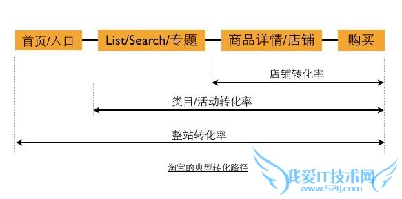 这是典型的淘宝浏览路径,所有的转化都是在一个路径上去算的。这里面就有几个转化。每天到淘宝有几千万人,其中购买了几百万单,所以全站的购买转化率在5%-10%吧。 同时呢,淘宝运营看的是从各自搜索和类目页、活动页面进入之后产生的购买,“购买UV / 进入类目和活动的UV”就是类目和活动的购买转化率。