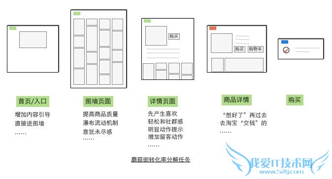 看出蘑菇街这样的网站做的事儿了吧?就是想办法提高各种转化率。我们的运营团队每天做的事儿,就是用各种机制控制用户在图墙上看到的商品质量,让更多人点“喜欢”和看详情,然后促成在详情页“下定决心”。