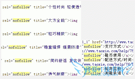 相信在第一部分之中,大家回问,为何栏目页中的首页没有nofollow掉吧,这个原因你看得到的网页对于搜索引擎来说却是看不到的,在淘鞋网的目录页和产品页中,淘鞋网使用了如下的方式,如截图