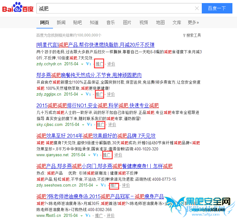 在评估关键词的竞争度时,该关键词的竞价推广数,就是考量竞争度的一个指标。例如,关键词“减肥”的竞价推广数在百度搜索引擎中的效果如下图所示。其中搜索栏下方,以及整个区域右侧显示的都有比较多的推广链接。如果这个词没有竞价推广,那么在那些区域将不会有这些内容的显示。