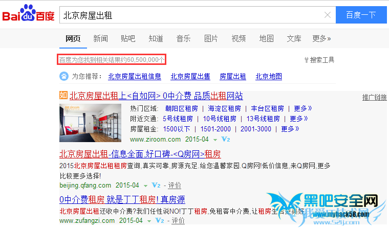 这个关键词的相关搜索结果数量可以作为评估关键词竞争度的一部分。如果该关键词被搜索引擎收录的页面数在300万以下属竞争度小的,300万~500万属中间,500万以上属高竞争度的。例如,关键词“北京房屋出租”的相关搜索页面数如下图所示,是其在某一搜索时间内的值,当然这个值是在不断变化的。通过该值可以发现这是一个竞争度相当大的关键词。
