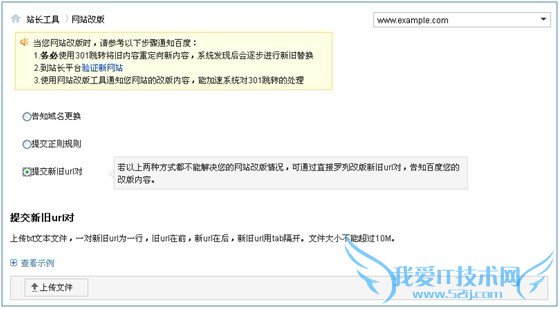 在改版工具页面中选择“提交新旧url对”方式之后,可直接上传txt文本格式的url文件,需要注意文件的格式“一对新旧ur为一行,旧url在前,新url在后,用tab隔开,再换行。文件大小不能超过10M”。