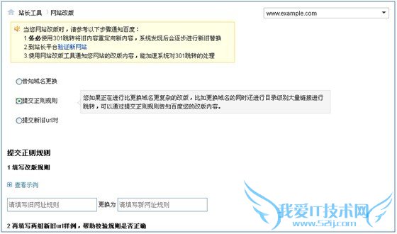 如果正在进行比更换域名更复杂的改版,比如更换域名的同时还进行目录级别大量链接进行跳转,可以通过提交正则规则告知百度您的改版内容。