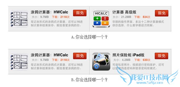 实例三:下面两个计算器应用推荐中,假如你没有涂鸦的偏好,只要有计算的基本功能就行,你会更容易选择哪一个?