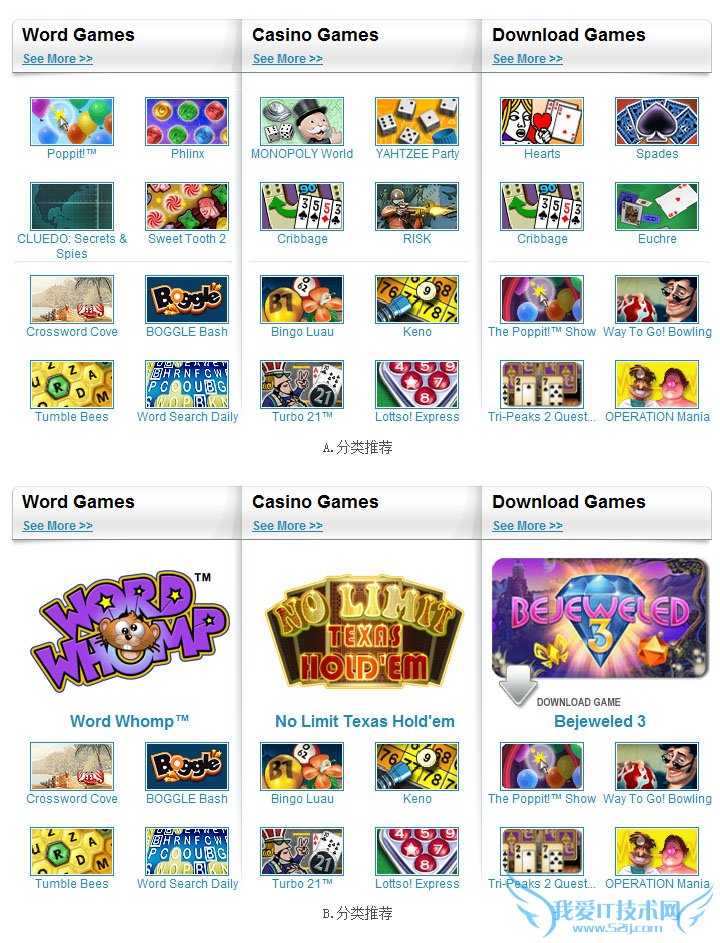A中应用分类虽然有条理,但从视觉上看却没有重点,选择太多而没有了点击的欲望。B将四个小图标换成一个大图标,加强了分类效果,让页面有了层次感,视觉上更清晰。所以,并不是推荐的链接数越多越好,而是要把用户从繁复的信息中拯救出来,给他一个理由,让他更容易做选择。