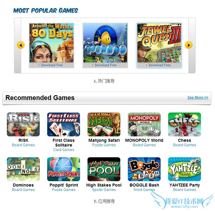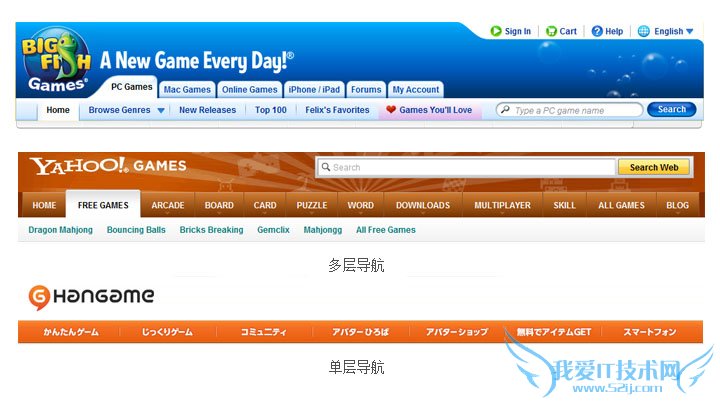 由于应用中心的产品种类数量都较多,如果在首页导航设计地过于简洁,那势必会造成二级页面中还会有导航,页面切换变多,造成操作上的麻烦。不少国外游戏中心采用的都是首页双层导航的设计,一来减少页面跳转,二来用户对本站的内容一目了然,不必一一点进去看。双层导航的网站给人的感觉内容也会比单层的详实一些。