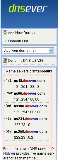 1:先登录好,在左侧你会看到有5个DNS服务器列表(注意:每个账户的DNS表都随机不一样的),去域名注册商那里把你的域名DNS改成分配给你的5个DNS。