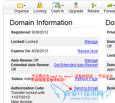 Godaddy需要做的:登陆 GODADDY→All Products →Domain → Domain Management →点击你的域名→点击Manage →弹出的对方框中,把Lock domain(s) 前边的√去掉,然后点击OK→然后找到“send by email” ,点击它。好了,去你域名注册时留下的邮箱中查看转移码吧!操作如图: