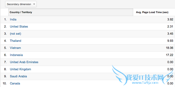 当然,Google Analytics 分析了平均载入时间,而这分析影响了结果。但将这与其他分析结果放在一起看,似乎还是可以得出一些结果。Cucumbertown 的连结被放在一个奈及利亚的美食频道和一个泰国的知名博客上,导致大量的流量湧入。网页载入速度在这些国家就如同你所看到的,可笑的慢。