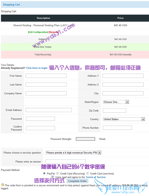 第六步,输入个人信息,拼音就可以了。选择购买支付方式,支持paypal和信用卡购买。购买支付完毕后,官方会发送一封确认开通信件到你的邮箱,所以邮箱必须填写正确,以后便于交流和确认账户密保使用。