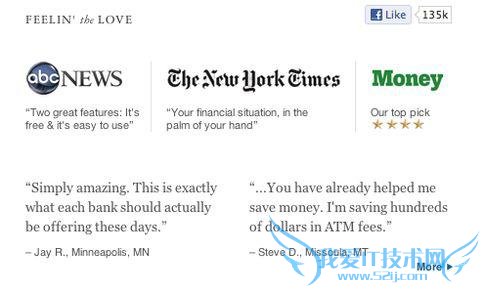 有时提供口碑信息可以促进对产品效果的认可,尤其是对于电商产品。Mint.com在首页上展示了名人认可和客户口碑。我没有关于这种方案有效性的数据,但你可以考虑向他们学习。口碑信息并不是总有用。比如Facebook就从不会标榜这个,但对于财务服务类产品而言,口碑就很可能是有用的。