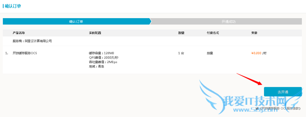 这里要注意的地方我都圈了起来,首先缓存容量一定要选择128M的,因为只有这个才可以免费使用。地域就选择你的ECS所在的节点,由于笔者是用的青岛节点所以就选择青岛,然后确认配置费用是否为0元,最后点击立即开通。