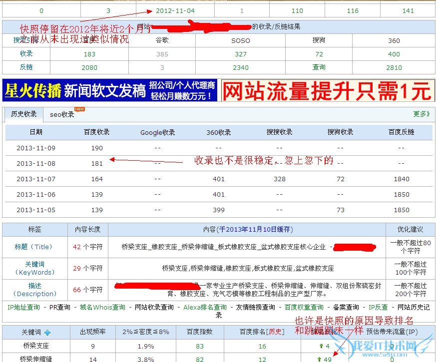 关于网站不断被降权的分析,由于百度连续在七、八、九、十月份不断重手出击,连续打击了一批垃圾低质量站点,保护了大部分的正规站点,但是也不乏有一些站点被无辜牵连,而导致被误伤。而我也在这大潮中受到了前所未有的冲击,手头的站点几乎全军覆没。