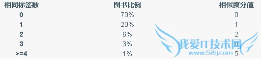 有了基础数据和算法的支持,我们就可以创建数据模型了。先看下基础数据的类型,作者、分类、来源和标签都是字符型,其中作者、分类、来源基本可以当做是单个值的属性,标签一般包含多个值。首先由于都是字符可以确定属性之间相似性的判定只能通过“是否相同”,无法体现数值上的差异,所以对于作者、分类、来源这几个单值属性而言,比较的结果就是一个布尔型的度量,相同或者不相同;对于标签这个多值属性可以考虑使用Jaccard相关系数,但因为每个内容标签的个数存在较大差异,使用验证后的结果并不理想,所以不考虑使用(当然,如果内容的标签个数比较固定,Jaccard相关系数是有效的)。因此,直接创建加权相似度模型如下,首先是标签的相似度分值设定: