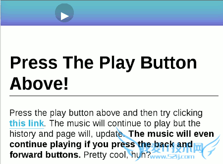 Ëùν History API£¬Ö¸µÄÊDz»Ë¢ÐÂÒ³ÃæµÄÇé¿öÏ£¬¸Ä±ää¯ÀÀÆ÷µØÖ·À¸ÏÔʾµÄURL(׼ȷ˵£¬ÊǸıäÍøÒ³µÄµ±Ç°×´Ì¬)¡£ÕâÀïÓÐÒ»¸öÀý×Ó£¬Äãµã»÷ÉÏ·½µÄ°´Å¥£¬¿ªÊ¼²¥·ÅÒôÀÖ¡£È»ºó£¬ÔÙµã»÷ÏÂÃæµÄÁ´½Ó£¬¿´¿´·¢ÉúÁËʲôÊ£¿
