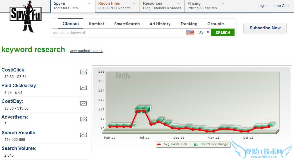 SpyFu – Provides search volume, number of clicks per day and their average daily cost, the actual number of advertisers currently bidding on the keyword and the actual AdWord ads that are running (click to enlarge).