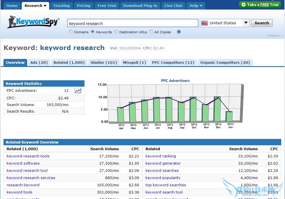 Keyword Spy - Is one of my favorites for getting a quick sense of the landscape. It very quickly (through use of tabs) gives you access to data on PPC ads, related keyword phrases, your paid and organic competitors, andmy favorite; misspellings! Did you know that keyword reserach has an estimated 110,000 searches per month! See a screenshot of the dashboard below(click to enlarge).