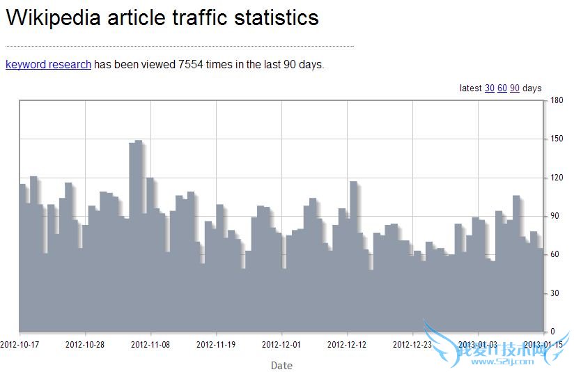 Pay attention to the average index of interest over time, since it can be a bit confusing; 100 here represents the highest search volume there has ever been, it is not the integer for number of searches. So what you are looking for is that the current interest has not fallen off completely, looking at the graph it seems the current search volume for keyword research is down about 50% from what it was in August 2010. Next you use a bit of a 3rd party litmus test to see how popular a topic really is, and a safe bet here is to use the worlds most popular encyclopedia, Wikipedia. Domas Mituzas has built a statistical engine that tracks Wikipedia’s pageviews. And looking at it over the past 90 days we can see that the term has been viewed 7,554 times (hat tip to Glen Allsopp for sharing this). Click to enlarge.