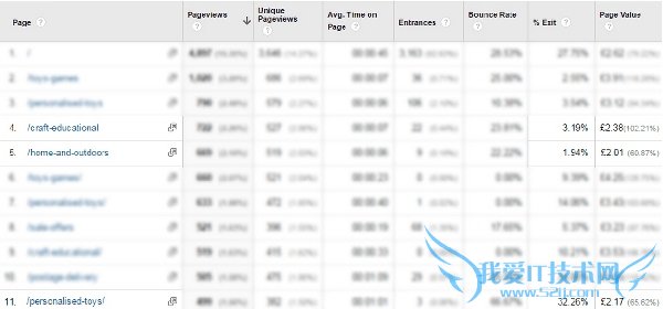 一个高价值但是展示出高退出率的页面是值得重视和改进的。意味着这些页面让用户在回话流程的关键位置离开了。在下面的的例子中(一个电子商务网站),我突出显示了三个有着类似的页面价值的品类。可以清楚地看到, “个性化化玩具(personalised-toys)”的产品页面有一个相当高的退出率。这说明这个高价值的页面正在让用户“流失”,并且应该在未来的用户体验设计工作中引起重视。