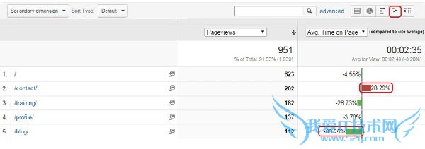 另外一个衡量页面表现的非常好的方式是利用 “与网站平均数比较”的选项。这个图会显示某些页面在某个参数上是不是在很大程度上高于或者低于平均值。虽然这些页面仍然需要一页一页地分析,因为不同的页面有用不同的目标,但是低于平均浏览时间的页面总体来说可能会有问题,假设目标是为了让用户继续阅读的话。下面的例子清晰地表现出“联系 (contact)”页面相对来说有比平均值更低的浏览时间,然而“博客(blog)”页面有高于平均值80%的时间。