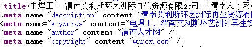 内页标题:电焊工- 渭南艾利斯环艺洲际再生资源有限公司- 渭南人才网,内页关键词:电焊工,渭南艾利斯环艺洲际再生资源有限公司,内页描述文字:渭南艾利斯环艺洲际再生资源有限公司招聘电焊工。由于一个人才网站上有很多的职位和简历信息,所以内页的meta信息都是由程序生成的,反观这个人才网的内页meta信息是不是有点不合理呢?长尾词的选择不够精准。从 SEO角度考虑,页面的标题是最重要的信息,通常我们会把最重要的信息放在标题文字的最前面,再从用户的角度出发,一个企业在你的网站上发布招聘信息,自然是想更多的应聘者看到这条信息,所以内页的收录率和排名非常重要,笔者认为这个人才网站的内页meta信息可以这样写: