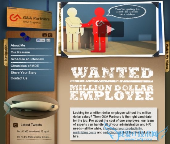 来看看就会发现,其实这不是一个想找工作的人,而是一家专做HR(人力资源)的服务外包公司,有些小公司自行聘用人资主管或人资人员,做得不专业又零零落落,于是可以包给这种HR外包公司去处理薪资、绩效评估、教育训练…等;像这种与企业沟通的公司实在一大堆,每一家的官网都很有特色,实在很难脱颖而出!于是G&A就开了这么一个“百万员工.com”宣传自己的服务,还煞有其事的做了一个cover letter(美国人投履历都要先附上一封说明来意的信函),接着附上“履历表”,如果你想面试这位“百万员工”可以填写面试要求单……这样的营销官网,实在比一般microsite还让人感同身受这间公司想表达的信息。