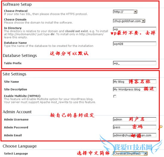 注意,建中文站的话,语言一定要选择中文简体Chinese(Simplified),默认是英语的。而在In Diretory这行,可以去掉wp,不然最终的访问地址会是你的域名/wp.