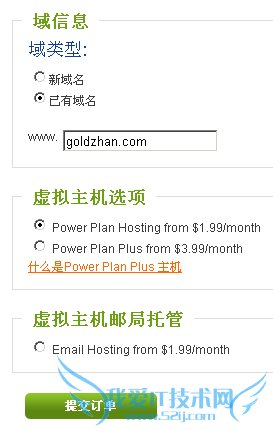 点击立即注册后,刷出一个新的页面,要你填写下域名信息和所需购买的主机类型。域名的话,如果没有域名的朋友,就需要购买一个新的域名,这款主机是没有附赠域名的,注册一个新的域名,需要14.95美元,比较贵。主机的话,可供选择的有两款主机,我们通常选择1.99美元的这款,性价比高,但只适合做博客或者是企业站,如果要做论坛的朋友,那么我建议你购买$3.99/month的Power Plan Plus主机: