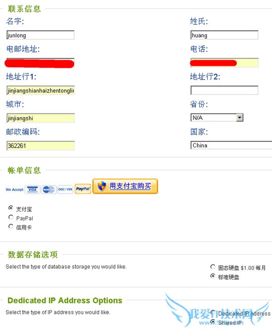 接下来的话,是填写下个人信息,地址、名字、城市这些都用拼音填写下。付款的话,咱们可以选择支付宝或者paypal。数据存储的话,如果对于数据存储的要求比较高的话,可以选择固态硬盘,在数据读取方面,会快很多,但是每个月要加1美元。至于独立IP的话,每个月要加2.5美元,一般选择 Shared IP共享IP就好。