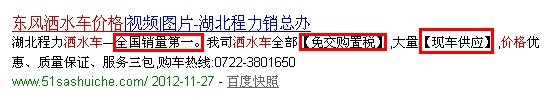 这是我们公司的一个洒水车网站,我们的洒水车销量是全国第一,并且我司生产的洒水车可免交购置税,另外我们又发现很多用户购车是非常急的,因而我们就突出我们有现车供应,这是非常满足用户需求的,因而这样的网站会吸引更多用户的点击。每一个公司都有一些区别于其它公司的地方,或者具有其它公司没有的优势,那么我们就可以利用这些差异性来吸引用户。